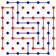 The Shannon switching game is a connection game for two players, invented by American mathematician and electrical engineer Claude Shannon, the "father of information theory" some time before 1951.[1] Two players take turns coloring the edges of an arbitrary graph. One player has the goal of connecting two distinguished vertices by a path of edges of their color. The other player aims to prevent this by using their color instead (or, equivalently, by erasing edges). The game is commonly played on a rectangular grid; this special case of the game was independently invented by American mathematician David Gale in the late 1950s and is known as Gale or Bridg-It.[2][3]