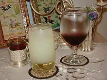A simple sherbet of lemon, citric acid and water, without additional spices, is called nişan şerbeti or "betrothal sherbet" in Turkish and is traditionally served at engagement ceremonies.[37] Some versions of lemon sherbet may be optionally flavored with honey and cloves.[38] A similar sherbet flavored with cloves and lemon juice can also be made with fresh peaches.[39] Green apple and cinnamon is another possible flavor combination.[40] One recipe for "Ottoman sherbet" calls for sugared sour cherries, dried plums, golden raisins, fresh ginger, cloves, cinnamon sticks to be simmered together.[41]