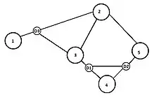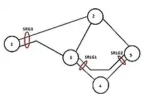 ![]() This graph meets the restriction 1 because the node 3 has a degree of 3 meanwhile it only has 2 incident SRLGs |