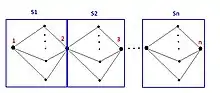 The SRG diverse routing problem has proven to be NP-complete. To prove something is NP-complete, it is sufficient to prove that the problem closely resembles another well-known NP-complete problem. To prove the case, engineers introduce a graph, as shown in the picture. The graph depicts that, between two nodes, there exist multiple paths, which may include other nodes. The parallel paths in sub-graphs (circled in blue) belong to the same SRLG.