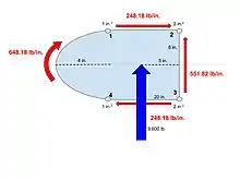 For thin-walled profiles, such as that through a beam or semi-monocoque structure, the shear stress distribution through the thickness can be neglected.[2] Furthermore, there is no shear stress in the direction normal to the wall, only parallel.[2] In these instances, it can be useful to express internal shear stress as shear flow, which is found as the shear stress multiplied by the thickness of the section. An equivalent definition for shear flow is the shear force V per unit length of the perimeter around a thin-walled section. Shear flow has the dimensions of force per unit of length.[1] This corresponds to units of newtons per meter in the SI system and pound-force per foot in the US.