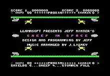 Sheep in Space is a video game written by Jeff Minter for the Commodore 64 and published in 1984 by Llamasoft. It is a horizontally scrolling shooter which borrows gameplay from Defender re-themed to involve sheep.[3] The title screen features an arrangement of Bach's "Sheep May Safely Graze" by pianist James Lisney.