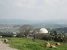 A small double-domed Maqam (shrine) holding the tomb of a Muslim saint, Sheikh Abreik or Ibreik, stands on the ridge of the hill and is still a site of ziyārah-type pilgrimage.[4] At the time of the Survey of Western Palestine, its interior was painted red.[7] Gottlieb Schumacher noted in the 1890s that: "The shrine of Sheik Abreik is still highly venerated by the Bedouin of the Merj ibn Amir. According to their tradition the Sheikh lived [before] the Prophet; it is a fact, that if you take an oath from a Bedawy, and make him swear by Sheikh Abreik, he will not deceive you."[8] Tawfiq Canaan, the Palestinian physician and ethnographer, who wrote about the shrine of Sheikh Abriek in 1927, noted that it was also a site frequented by women seeking to remedy infertility: "After a barren woman has taken a bath in el-Matba'ah she washes herself in Ein Ishaq ["Spring of Isaac"]; she goes then to ash-shekh Ibreik to offer a present."[9][10] Sheikh Abreik is described by Moshe Sharon as a local saint believed to have bestowed the nearby swamp of al-Matba'ah with healing properties that were said to be useful in treating rheumatism and nervous disorders.[11] Sharon sees the possibility that an Abbasid-period poem found written on the wall of a nearby catacomb might mark the beginning of the maqām of Shaykh Abreik.[4]