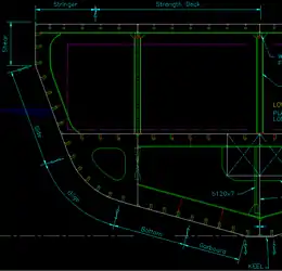 A strake is the name given to each line of planking in a wooden vessel.[1] In modern ship construction it refers to the longitudinal run of plating covering the hull, deck and bulkhead structure. Certain specific strakes are uniquely identified: