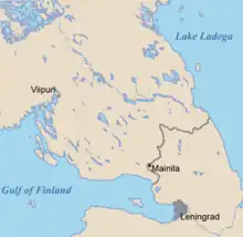 Location of Mainila on the Karelian Isthmus shown in relation to the pre-war Finnish-Soviet border.