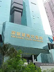 The Shenzhen Stock Exchange (SZSE; Chinese: 深圳证券交易所) is a stock exchange based in the city of Shenzhen, in the People's Republic of China. It is one of three stock exchanges operating independently in Mainland China, the others being the Beijing Stock Exchange and the Shanghai Stock Exchange. It is situated in the Futian district of Shenzhen.[3]