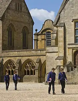 The school continues to occupy the site of the former monastery; the school chapel (12th century, modified in the 15th, 19th, and 20th centuries), library (13th century, 15th century roof and windows), and the Abbot's House (c. 1480), occupied by the headmaster and the senior staff, are all former monastic buildings. The outlines of the monastic cloister, and curious first floor Abbot's Chapel, are visible on the walls beyond the Abbot's House.[9]