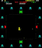 16 bandits (also referred to as 'gangs')[10] surround the outer rim, marked by a dotted "fence". Bullets from either Mr. Jack or the bandits can destroy the fenceposts, and they can function as defensive walls or aiming obstacles for the player. Larger barriers also exist on the midpoint of each side of the screen, and bullets from either Mr. Jack or the bandits will slowly erode these. The top and bottom barriers display the current level number.