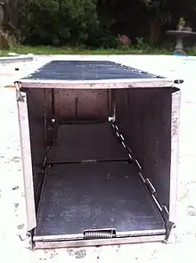 The hinged design allows the trap to fold up flat into something only the width of one side panel. This makes it compact for storage and easy to transport to field locations (e.g. in a back pack). Both ends are hinged, but in normal operation the rear end is closed and the front folds inwards and latches the treadle, trigger plate, in place. When an animal enters far enough to be clear of the front door, their weight releases the latch and the door closes behind them.