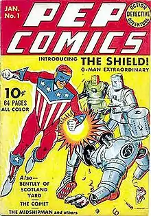 The Shield is the name of several superheroes created by MLJ (now known as Archie Comics). Appearing months before Captain America, the Shield has the distinction of being the first superhero with a costume based upon United States patriotic iconography. The character appeared in Pep Comics from issue #1 (Jan 1940) to #65 (Jan 1948).[1]