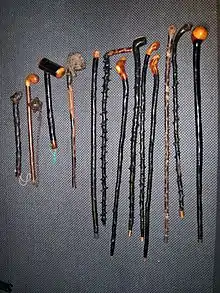 The loaded types needed to have its knob fitted with iron ferrules to maintain structural integrity,[17] and the sticks also have iron ferrules fitted onto their narrow end.[14][18][8] Shillelaghs may also have a heavy knob for a handle which can be used for striking.[9] Shillelaghs may also have a strap attached, similar to commercially made walking sticks, to place around the holder's wrist.[19]