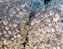 | A large number of adults and egg cases (white dots) of the hydrothermal vent species Shinkailepas kaikatensis with an arc crab on the right | |