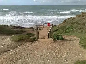It was a small sandy coastal gully; however, it has been redirected through a culvert down to beach level to reduce its effect on erosion to the cliff. A set of steps have been attached to the culvert to provide access to the beach of Compton Bay.