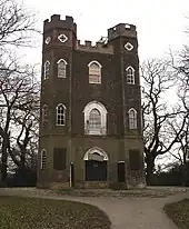 Another water tower (of 130 ft) is further west down Shooter's Hill. This was originally built in the 1890s to designs by Thomas W. Aldwinckle to supply water to the 'Brook Fever hospital', which was demolished in the 1990s, to be replaced by a housing development. The tower consists of a plain brick pillar ornamented simply with bands of terracotta tiles and windows like arrowslits. It is not listed, but it was cleaned, repointed and underpinned for conversion into a family home. It is the centrepiece of the housing estate.[8]