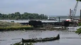 The first shipyard on Shooters Island was created in 1860 by David Decker.[2] From 1898[3] until 1910, the island was home to a major shipyard, the Townsend-Downey Shipbuilding Company. Theodore E. Ferris, who later designed the eponymous ships used by the American government in World War I, was an employee of the firm.[4] Around this time it was also home to the Standard Shipbuilding Company, which bought the island in 1915.[3] The entire island was occupied by buildings, including a foundry, pattern shop, and offices. There were major docks and shipways that faced to the east. Contrary to a previous report, President Theodore Roosevelt did not go hunting on this industrial island.