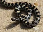 The short-tailed snake is a small serpent averaging 36–51 cm (14–20 in) in total length, with a record total length measurement of 65.4 cm (25+3⁄4 in),[5] and is perhaps as thin as a pencil. It is gray above with 50 to 80 dark blotches and may or may not have a yellow stripe running down the spine. The underside is white with dark brown blotches. It bears a more-than-superficial resemblance to other kingsnakes, especially the mole kingsnake (Lampropeltis calligaster rhombomaculata), but can be distinguished by its smaller size and much more slender build.[6] Also, Lampropeltis extenuatum has six upper labials, whereas kingsnakes (genus Lampropeltis) have seven upper labials.[7]