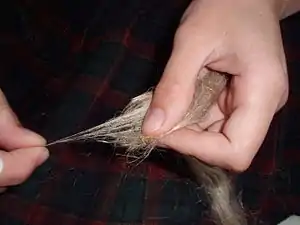 There are three subtypes within the short draw technique, depending on which hand is active. In forward short draw, the hand closest to the wheel is the active hand. The passive hand stays in the same place throughout, gently holding the fibers fanned out into a triangle shape known as the drafting triangle. The active hand moves forward as it pulls fibers from the drafting triangle, and then back as it allows twist into the newly created yarn. Generally about an inch of fibers are pulled from the drafting technique, much less than the fiber length. While drafting (pulling the fibers from the drafting triangle) the twist is kept out of the yarn, and is only allowed in as the active hand moves back towards the passive one. The twist is never allowed to get between the active and the passive hand. When the active hand is back at the distance of the staple length from the passive, the whole technique repeats. [1]