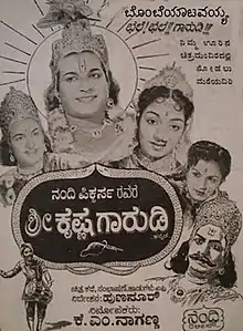Shree Krishna Gaarudi is 1958 Indian Kannada language film written and directed by Hunsur Krishnamurthy based on the story by Bellave Narahari Shastri. It narrates the tale of Bheema and Arjuna's pride being crushed by Krishna, after the Kurukshetra War. The bickering and squabbling among the Pandavas for portfolios allegorizes the politics in the then newly formed Mysore state.[1][2] The movie was remade in Telugu in the same year by well-known director Y. V. Rao starring Jaggayya also titled Shri Krishna Garudi .[3]