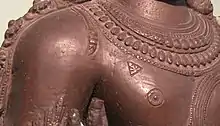In South India, in the bronze sculptures made after circa 10th century, the Shrivatsa symbol is shown as an inverted triangle on the right chest of Vishnu, and his various incarnations.[6]