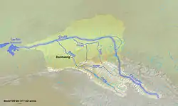In 1734, a 30-kilometer-long channel was built in the Caotan of Yinmachang to divert water for irrigation.[3] In the Shule River Basin, 5 reservoirs, including the Shuangta Reservoir, the Danghe Reservoir and the Chijinxia Reservoir, have a water storage capacity of 1 million cubic kilometers. Reservoir above the foot.[4] The alluvial plain in the middle and lower reaches is an agricultural area, and the river runoff decreases year by year due to the increase of irrigation diversion.[1] Historically, the Shule River has flowed into Lop Nur seasonally. Due to excessive irrigation and diversion, the river can only flow to Hala Lake, which is 131 kilometers away from the Lop Nur Basin.[3][7]