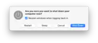 In Apple macOS the computer can be shut down by choosing "Shut Down…" from the Apple Menu, by pressing Control+Power key/button (or Media Eject key), or by pressing the power key to bring up the power management dialog box and selecting button "Shut down". An administrator may also use the Unix shutdown command as well.[7] It can also be shut down by pressing Control+⌥ Option+⌘ Command+Power key/button (or Media Eject key) or clicking Shut Down on the Apple Menu while holding the ⌥ Option key, but this will not prompt the user anything at all.[8] On newer and some older Apple computers, starting with Mac OS 9, the user is given a time limit in which the computer will automatically shut down if the user does not click the "Shut Down" button.