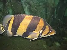 The Siamese tigerfish (Datnioides pulcher), also known as the Siamese tiger perch, is a critically endangered Asian fish native to the Chao Phraya, Mae Klong and Mekong basins.[1] It has vertical yellow and black stripes running the length of its body. The dorsal fin has a spiny appearance.[2] Siamese tigerfish grow to 40 cm (16 in) in standard length.[3]
