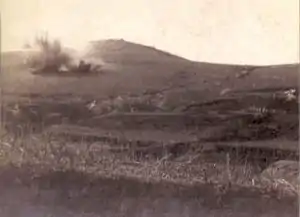 On September 18, Japanese General Kodama visited General Nogi for the first time, and drew his attention to the strategic importance of 203 Meter Hill.[4] Nogi directed the first infantry assault against the hill on September 20,[2] but found its fortifications impenetrable to Japanese artillery and was forced to retreat by September 22 with over 2500 casualties.[4] He then resumed his attempts to break through the fortifications at Port Arthur in other locations, cumulating in a six-day general assault at the end of October, which cost the Japanese a further 124 officers and 3611 men.[4] News of this defeat inflamed Japanese popular opinion against Nogi. General Yamagata Aritomo urged his court-martial, but Nogi was saved from this only through the unprecedented personal intervention of Emperor Meiji. However, Field Marshal Oyama Iwao found the continuing unavailability of the 3rd Army's manpower to be intolerable, and sent General Kodama Gentarō to compel Nogi to take drastic action, or else relieve him of command. Kodama returned to visit Nogi again in mid-November, but decided to give him one last chance.[5] After arduous sapping work and an artillery assault with the new Armstrong 11-inch siege guns, mines were exploded underneath some of the Russian fortifications on the main defense perimeter from November 17–24, with a general assault planned for the night of November 26. Coincidentally, this was the same day that the Russian Baltic Fleet was entering the Indian Ocean. The assault contained a forlorn hope attack by 2600 men (including 1200 from the newly arrived IJA 7th Division) led by General Nakamura Satoru,[5] but the attack failed, with direct frontal assaults on both Fort Erhlung and Fort Sungshu once again beaten back by the Russian defenders. Japanese casualties were officially 4,000 men, but unofficially perhaps twice as high.[4] Russian General Roman Kondratenko took the precaution of stationing snipers to shoot any of his front line troops attempting to abandon their positions. At 08:30 on November 28, with massive artillery support, Japanese troops again attempted an assault up the sides of both Akasakayama and 203 Meter Hill. Over a thousand 500 lb (230 kg) shells from the 11-inch (280 mm) howitzers were fired in a single day to support this attack. The Japanese reached as far as the Russian line of barbed wire entanglements by daybreak and held their ground throughout the following day, November 29, while their artillery kept the defenders busy by a continuous bombardment. Nonetheless, the Japanese forces suffered serious losses, as the Russian defenders were well positioned to use hand grenades and machine guns against the tightly packed mass of Japanese soldiers. On November 30, a small party of Japanese succeeded in planting the Japanese flag at the summit of the hill, but by the morning of December 1, the Russians had successfully counterattacked. Still retaining the authority to replace Nogi if necessary, Kodama assumed temporary command of the Japanese front-line forces, but officially maintained the despondent Nogi in nominal command.[4]