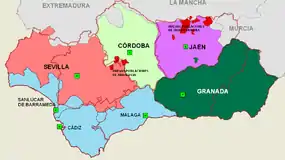 The bleak Sierra Morena mountains were also notorious in former times for being a haunt of bandits and highwaymen.[18] The Nuevas Poblaciones de Andalucía y Sierra Morena administrative division was started in 1767 during the reign of Charles III of Spain in order to populate the mountainous zone.[19] As a consequence the area around La Carolina was settled with farmers that included German, Swiss and Flemish families. One of the goals of the project was to have safe stopover points for carriages in the desolate region that would be within reasonable distance from each other.[20]