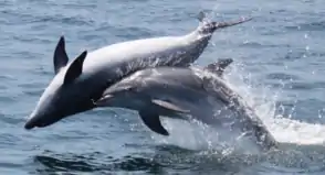 Whistle matching may occur when two or more groups of dolphins encounter each other, as well.[8] Bottlenose dolphins have low rates of aggression towards close associates and other members of the species.[10] It is observed when a dolphin copies another individual's whistle and repeats it back.[8] Matching occurs in order for one dolphin to acknowledge another individual's presence, which can occur when the animals are up to 600 meters apart.[8] Signature whistles may play an important role in interactions between groups.
