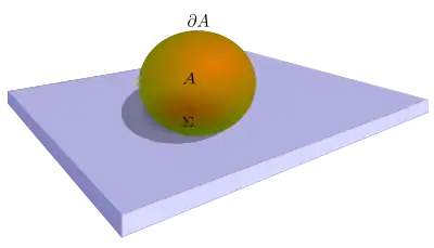 The content of this section and the following subsections follows closely the treatment of Gaetano Fichera in Fichera 1963, Fichera 1964b and also Fichera 1995: his derivation of the problem is different from Signorini's one in that he does not consider only incompressible bodies and a plane rest surface, as Signorini does.[8] The problem consist in finding the displacement vector from the natural configuration of an anisotropic non-homogeneous elastic body that lies in a subset of the three-dimensional euclidean space whose boundary is and whose interior normal is the vector , resting on a rigid frictionless surface whose contact surface (or more generally contact set) is and subject only to its body forces , and surface forces applied on the free (i.e. not in contact with the rest surface) surface : the set and the contact surface characterize the natural configuration of the body and are known a priori. Therefore, the body has to satisfy the general equilibrium equations