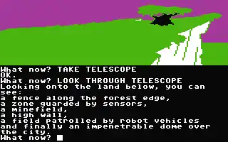 The games use a text parser for entering commands at the "What now?" prompt.[2] The parser can interpret more than a thousand words[3] to control movement or actions. It looks at the command, picking out two or three words it knows, ignoring the order, and tries to guess what is meant.[2] For movement, the usual commands for moving 'NORTH', 'SOUTH', 'EAST' and 'WEST' are available (and their abbreviated forms of 'N', 'S', 'E' and 'W') as well as 'UP' and 'DOWN' ('U' and 'D' respectively) and a number of other directions and 'modes' of movement (like 'JUMP'). For actions, it understands how to pick up objects, opening doors, lighting lamps, as well as dropping objects and wielding them.[2] Additionally, there are commands to invoke 'SAVE' and 'RESTORE' of game positions to cassette tape or floppy disk (for some systems also to RAM), ask for 'HELP', turn off pictures and turn them on again with 'WORDS' and 'PICTURES' respectively, an 'OOPS' command to undo previous commands.[4]