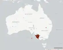 Silky mice are native to Australia, specifically south-eastern Australia (western Victoria).[3] They live in sandy heathlands near plants such as banksias, tea-trees, broombush and mallee eucalypts, which they use to shelter the entrance to their burrows. These mice will dig complex burrows about 2 cm in diameter with multiple tunnels and chambers.[2][3][1] In order to support their heavily herbivorous diet, they need a high plant diversity in their habitat consisting of plants which will bloom and bear fruit throughout the entire year. Silky mice are negatively affected by intensely high temperatures and water shortages.[2]