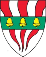 Silliman College's shield has a white background, three curving red lines emerging from near the bottom of the shield (representing salamander tails), and a green crossing bar containing three acorns. In heraldic terms, the shield is described as "Arms: Argent, three piles wavy gules, on a fess vert three acorns or." The colors represent the four ancient elements: red for fire, white for air and water, and green for earth. The acorns are an element taken from the family arms of Frederick Vanderbilt, 1876, who funded the college's construction.