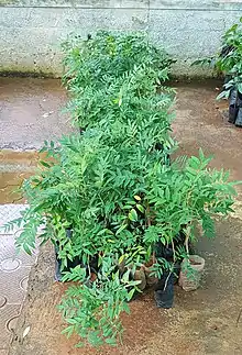 The main biologically active compounds found in S. amara are the quassinoids, a group of triterpenes including ailanthinone, glaucarubinone, and holacanthone. These have been reported to kill protozoa, amoeba, Plasmodium (the cause of malaria). The antimalarial properties were first investigated by scientists in 1947; they found that in chickens, 1 mg of bark extract per 1 kg of body weight had strong antimalarial activity. In 1997 a patent was filed in the United States for using an extract in a skin care product.[50] Simarouba amara is not to be confused with Simarouba glauca, which is known as Lakshmi Taru in India.