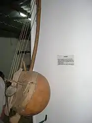 The simbing is an malian harp-lute, used by the Mandinka people of Mali, and Mandinka and Jola peoples of Senegal and Gambia.[2][3] The instruments consist of a calabash resonator, a (usually curved) stick for a neck, a metal jingle attached to the neck, and a bridge that holds the string over the skin soundboard in a vertical line.[2] For comparison lutes (such as the guitar) usually have the strings held in a horizontal line above the soundboard. The instruments have five to nine strings. The instrument from the 1790s was reported as having seven strings by Mungo Park.[4]