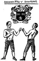 Very little is known of Byrne's early life beyond the fact that he was born in Ireland in 1806. His first fight, in 1825, was a loss to Mike Larking; it lasted 138 rounds spread over two and a half hours—despite the fact that at this time a round could vary in length, and usually only ended when a man was knocked down. His second fight was a draw against Jack Manning in 1826, earning Byrne £100. Next was Byrne's first match against the Scottish boxer Alexander McKay, which Byrne won easily in five rounds, earning him a further £100. This match was McKay's first ever prize-fight. This victory was soon followed by a win against Bob Avery, earning a further £50, then another win over Phil Samson in 1829, earning him £200. By the standards of the day these latter sums were enormous; it is therefore surprising that he was then offered £200 for a rematch, regardless of whether he won or not, against the less experienced McKay, whom he had beaten so easily on the first occasion.[5] As of 2008 that would be the equivalent of about £13,600.[8][lower-alpha 1]