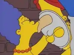 ![]() Marge kisses an upside-down Homer, dressed up as "Pie-Man" in a parody of a scene from the 2002 film Spider-Man. | |