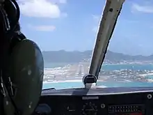 Approaching Princess Juliana International Airport at Maho Beach. Simpson Bay Lagoon is to the left.