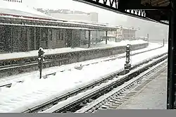 The city government took over the IRT's operations on June 12, 1940.[11][12] The Bergen Avenue cutoff, which allowed Third Avenue trains to access the White Plains Road Line, was abandoned on November 5, 1946, as part of the gradual curtailment of elevated service on the IRT Third Avenue Line.[5] On June 13, 1949, the platform extensions at this station, as well as those on White Plains Road Line stations between Jackson Avenue and 177th Street, opened. The platforms were lengthened to 514 feet (157 m) to allow full ten-car express trains to open their doors. Previously the stations could only accommodate six-car local trains.[13]