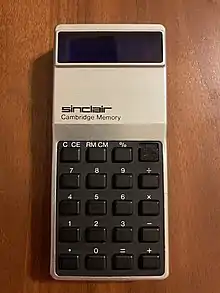 The Sinclair Cambridge was a pocket-sized calculator introduced in August 1973 by Sinclair Radionics. It was available both as kit form kit to be assembled by the purchaser, or assembled prior to purchase. The range ultimately comprised seven models, the original "four-function" Cambridge, which carried out the four basic mathematical functions of addition, subtraction, multiplication, and division, being followed by the Cambridge Scientific, Cambridge Memory, two versions of Cambridge Memory %, Cambridge Scientific Programmable and Cambridge Universal.[1]