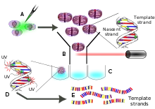 Cells of interest are cultured either in vivo or in vitro. During S-phase cells are treated with bromodeoxyuridine (BrdU) which is then incorporated into their nascent DNA, acting as a substitute for thymidine. After at least one replication event has occurred, the daughter cells are synchronized at the G2 phase and individually separated by fluorescence-activated cell sorting (FACS). The cells are directly sorted into lysis buffer and their DNA is extracted. Having been arrested at a specified number of generations (usually one), the inheritance patterns of sister chromatids can be assessed. The following methods concentrate on the DNA sequencing of a single daughter cell's DNA. At this point the chromosomes are composed of nascent strands with BrdU in place of thymidine and the original template strands are primed for DNA sequencing library preparation. Since this protocol was published in 2012,[1] the canonical methodology is only well described for Illumina sequencing platforms; the protocol could very easily be adapted for other sequencing platforms, depending on the application. Next, the DNA is incubated with a special dye such that when the BrdU-dye complex is excited by UV light, nascent strands are nicked by photolysis. This process inhibits polymerase chain reaction (PCR) amplification of the nascent strand, allowing only the parental template strands to be amplified. Library construction proceeds as normal for Illumina paired-end sequencing. Multiplexing PCR primers are then ligated to the PCR amplicons with hexamer barcodes identifying which cell each fragment they are derived from. Unlike single cell sequencing protocols, Strand-seq does not utilize multiple displacement amplification or MALBAC for DNA amplification. Rather, it is solely dependent on PCR.