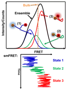 Single-molecule fluorescence (or Förster) resonance energy transfer (or smFRET) is a biophysical technique used to measure distances at the 1-10 nanometer scale in single molecules, typically biomolecules. It is an application of FRET wherein a pair of donor and acceptor fluorophores are excited and detected at a single molecule level. In contrast to "ensemble FRET" which provides the FRET signal of a high number of molecules, single-molecule FRET is able to resolve the FRET signal of each individual molecule. The variation of the smFRET signal is useful to reveal kinetic information that an ensemble measurement cannot provide, especially when the system is under equilibrium with no ensemble/bulk signal change. Heterogeneity among different molecules can also be observed. This method has been applied in many measurements of intramolecular dynamics such as DNA/RNA/protein folding/unfolding and other conformational changes, and intermolecular dynamics such as reaction, binding, adsorption, and desorption that are particularly useful in chemical sensing, bioassays, and biosensing.