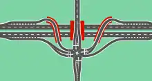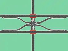 A three-level SPUI is similar to a standard SPUI but includes an additional grade separation allowing for free-flowing through traffic on the crossroad;[15][16] such through traffic thus bypasses the signalized intersection. The remaining intersection, free of the crossroad's through traffic, uses a two-phase traffic signal for handling the left turns in pairs, similar to the traffic flow at an inverted SPUI.