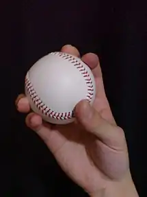 In baseball, a sinker or sinking fastball is a type of fastball which has significant downward and horizontal movement and is known for inducing ground balls.[1] Pitchers capable of utilizing the sinker are able to throw the pitch almost exclusively, as it forces weak contact and ground balls, allowing them to rely less on secondary pitches in order to change speeds.[2] While coaches agree that this pitch is very similar to the two-seam fastball, a two-seamer tends to have more lateral movement than a sinker.[3]