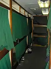 The boat was laid out with three decks. The upper deck contained the wheelhouse, crew quarters, and a sun deck lounge area. The main deck, just below the upper deck, included a large cabin, which had a galley (in the forward portion of the cabin) where the crew could prepare meals and a salon (in the aft portion) with seating for meals. The salon was accessed from the stern through a hallway lined with restrooms.[15] On the lower deck, up to 46 individuals could sleep in 13 double bunks (12 of which were stacked in twos) and 20 single bunks (18 stacked in threes), with one labeled as reserved for crew. The lower deck also contained the shower area, anchor locker, engine room, and lazarette (a machinery space).[5][11] The rest of the crew berths were located two decks above, in the aft portion of the wheelhouse on the upper deck.[15]