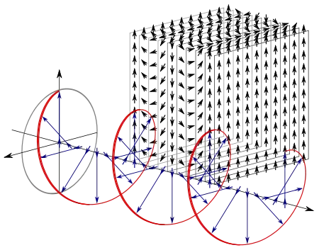 Represented in the second illustration is a circularly polarized, electromagnetic plane wave. Each blue vector indicating the perpendicular displacement from a point on the axis out to the helix, also represents the magnitude and direction of the electric field for an entire plane perpendicular to the axis.