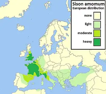 The species is found mainly within Southern and Western Europe near the Mediterranean Sea,[5][16][7][4][10][8] preferring a temperate climate.[7] On Continental Europe Stone parsley is present in Albania, Bulgaria, Romania, Greece and other countries of the Balkans,[7][4][5] and is also found in France, Italy, Spain, Switzerland,[16][7][5] and a very small presence in Belgium,[16][5] Germany, and Norway.[5] The plant also appears around the coast of the Black Sea, in Crimea, the Caucasus region,[16][7][5] and both European and Asian parts of Turkey,[7][8] as well as Algeria in North Africa.[7][18] Sison Amomum also grows on the island of Great Britain,[16][4][5][9][19][13] and the Mediterranean islands of Sicily,[7][5] Corsica,[16][7][5] Sardinia,[16][7][5] and the Balearic Islands.[7] In Britain it appears mostly in South East England, and in slightly lesser numbers in South West England, the Midlands and South Wales.[16][5][9][19][13] In North Wales, West Wales, Northern England and the Scottish Borders the plant is also present but is rarer[16][5][9][19] The species has not been reported in northern Scotland and is not present at all on the island of Ireland.[9][7][5][19] Stone parsley is also an introduced species in New Zealand, being more concentrated on the North Island.[5][20]