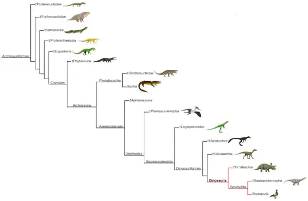 An example is birds, whose commonly cited living sister group is the crocodiles, but that is true only when discussing extant organisms;[3][4] when other, extinct groups are considered, the relationship between birds and crocodiles appears distant. Although the bird family tree is rooted in the dinosaurs, there were a number of other, earlier groups, such as the pterosaurs, that branched off of the line leading to the dinosaurs after the last common ancestor of birds and crocodiles.[5]