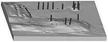 The first excavations at the site were carried out by B.B. Lal in 1948. An American-Indian team took up work in 2001. In 2005 ground penetrating radar revealed the probable position of the southern moat.[5] Toward the centre of the fortress (Area D) the 19 column structure has been recorded three-dimensionally by means of a laser scanner. It is disturbed and incomplete. Two gates pierce each of the glacis of the quadrangular plan. As at contemporary Jaugada, the plan tips 10° clockwise of north.[6] With 1,125 m × 1,115 m (3,691 ft × 3,658 ft) (measured on the crest), Sisupalgarh is larger in surface than is Jaugada. Sisupalgarh's defences are the highest known of this period in India. The ancient settlement probably was not dense, but rather there was room inside the fortress to graze.