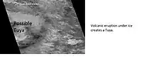 Some researchers have suggested that a large ice sheet covered much of the Mare Australe quadrangle.[7] [8] [9] Sisyphi Montes consists of about 100 dome-like structures that resemble volcanoes that have erupted under ice sheets on the Earth.[10] Similar shapes are present in Iceland. These domes are quite far from the present ice sheet (1,600 kilometers). The current cap is only about 350 kilometres across, so the ice cap in the past would have been way bigger and held much more water.[11] Measurements with the Compact Reconnaissance Imaging Spectrometer for Mars CRISM detected minerals that are formed when a volcano erupts under an ice sheet. Some of the minerals found are clays, sulfates, Iron oxides, and zeolites. This combination is often called palagonite.[12] [13] When volcanoes erupt under an ice sheet large masses of warm water are created. Masses of warm water under Martian ice could provide suitable places for life to exist. Such environments are also good for preserving fossils.[14]